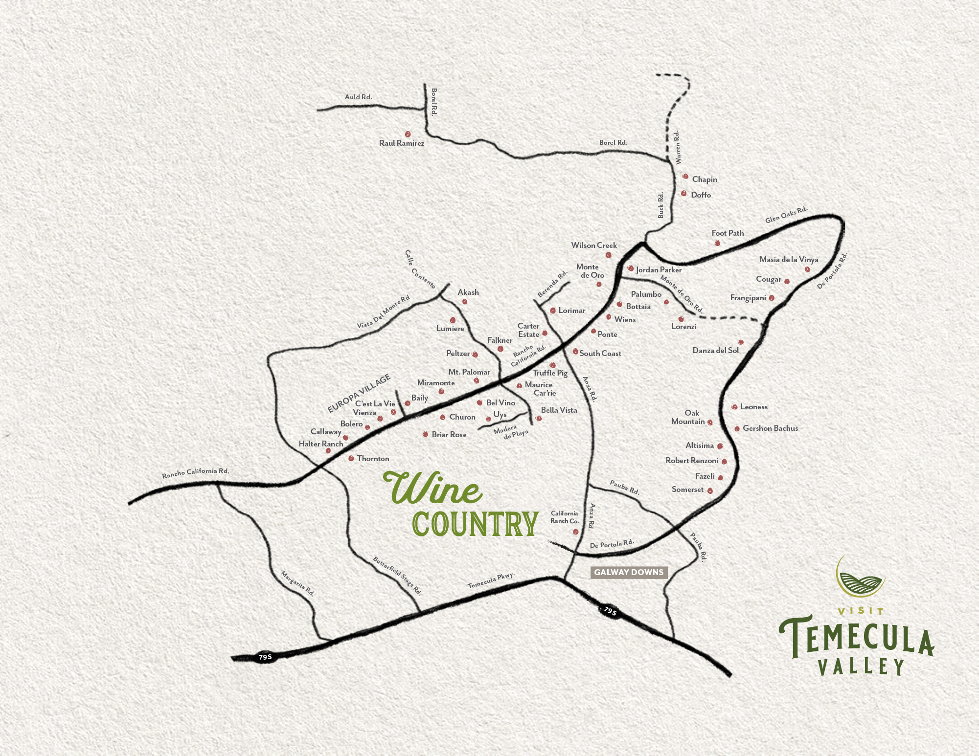 Visitors to Temecula Valley will find the majority of wineries clustered east of I-15 along and around Rancho California and De Portola Roads, with some located along Calle Contento as well. Each wine trail boasts its own unique personality, but all tasting rooms are warm and welcoming, inviting wine lovers of all kinds – from the novice to the aficionado – to uncover the story of Temecula Valley Southern California Wine Country.
